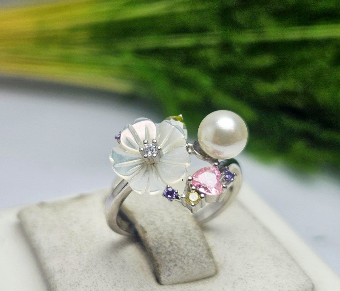 انگشتر نقره زنانه جواهری زیبای صدف و مروارید اصلی