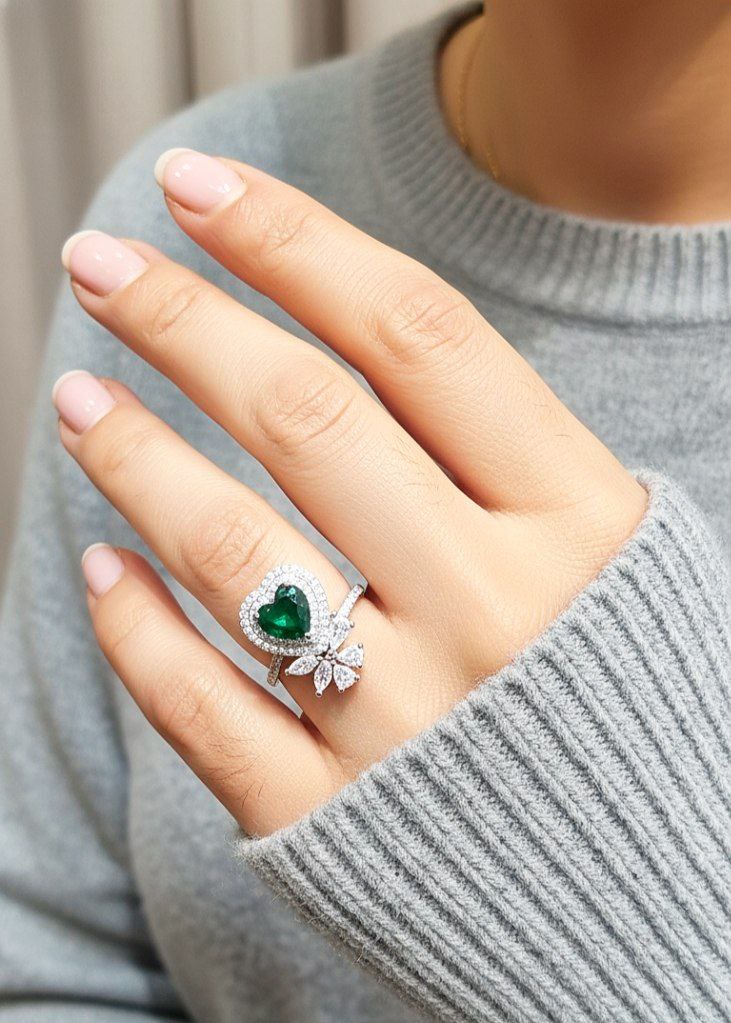 انگشتر نقره زنانه نگین سبز قلبی تراش